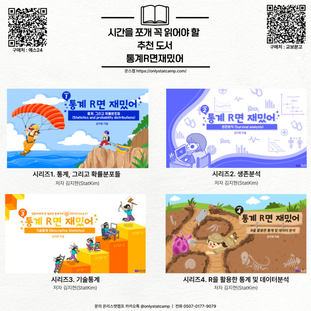 #R코딩 #RStudio #통계 #확률분포 #생존분석 #기술통계 #데이터분석 #교보문고 #알라딘 #예스24 #온스캠 #온리스탯캠프 #도서추천